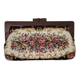 Vintage Floral Tapestry Hinged Clutch Purse Handbag Lucite Kiss Lock Hong Kong
