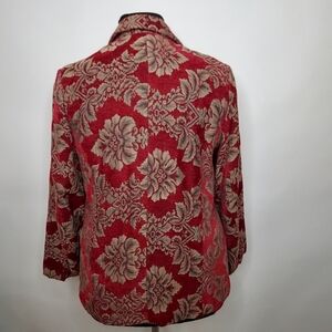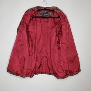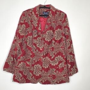 Vintage Tapestry Jacket Size 1X Denim & Co. Lined Floral Retro Button Up. Colors are a dark red with a gold/tan floral pattern.