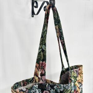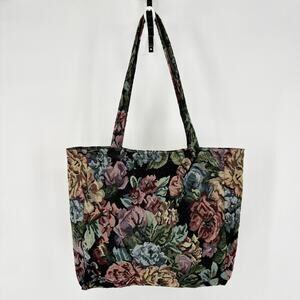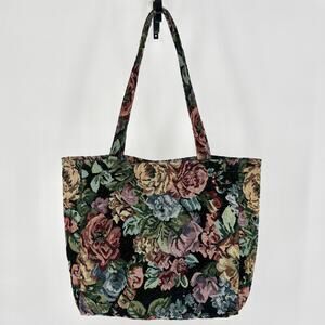 Beautiful vintage-inspired floral tapestry tote bag featuring a rich woven pattern of roses and greenery in deep jewel tones.