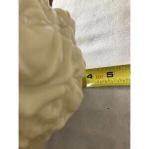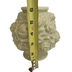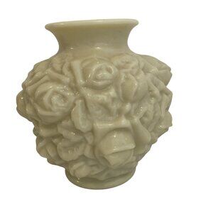 This vintage ceramic vase features an intricate rose design, exhibiting a creamy ivory finish that complements various home decors. Its classic form and detailed artistry make it a timeless collectible. The vase's construction ensures durability, while its elegant appearance adds a touch of sophistication to any setting.