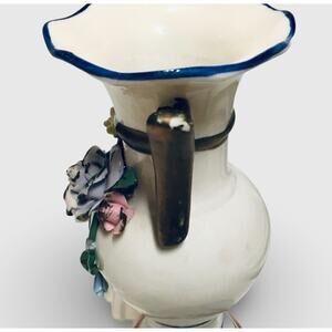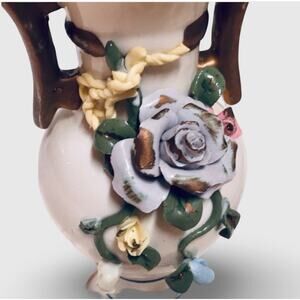 This listing is for vintage floral vase in good condition. Some wear on the back and handles (paint wore off from handling). Otherwise, no flaws. Features 3D floral decoration and classical shape. Ceramic construction.