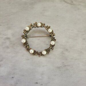Vintage Floral Wreath Circle Brooch Pin Gold Tone Faux Pearl Flower Jewelry