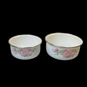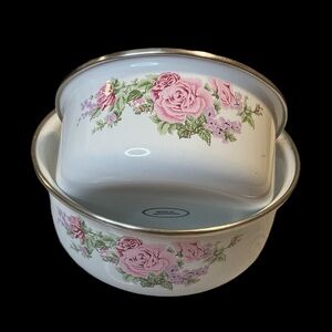 Vintage Kobe Kitchen White Floral Metal Enamel Mixing Bowl with Pink Roses