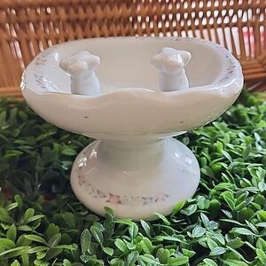 white glossy glazed ceramic sink soap dish with soft pastel flowers surrounding sink basin and pedestal base