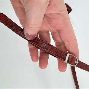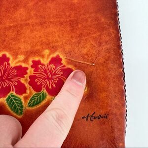 Stunning tooled leather Crossbody purse. This says Hawaii and has a Floral detail at the center of both sides. The corners are woven together. This has a long strap that is adjustable.