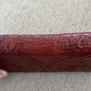 Beautiful tooled leather wallet. Features intricate flower designs. Secure clasp closure.