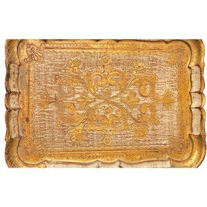 This Italian Florentine wooden tray features a gold gilded finish with ornate detailing, adding an elegant touch to serving or home decor. Its vintage charm and quality craftsmanship ensure it is as practical as it is stylish.