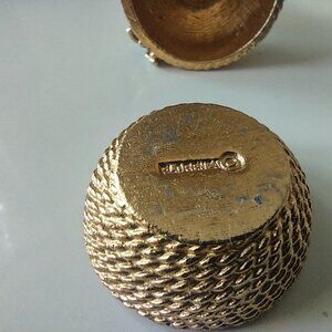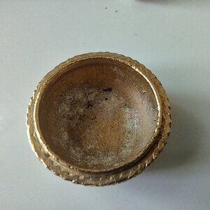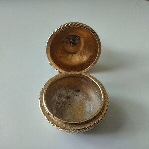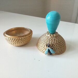 Adorable, petite, elegant gold tone and turquoise decorative trinket box with bumble bee accent. Can also be used as a pill box provided pills are small. Diameter measures 1" and .5" deep. Looks great as a decorative item in bathroom, dresser, vanity, collection cabinet.... Good vintage condition.