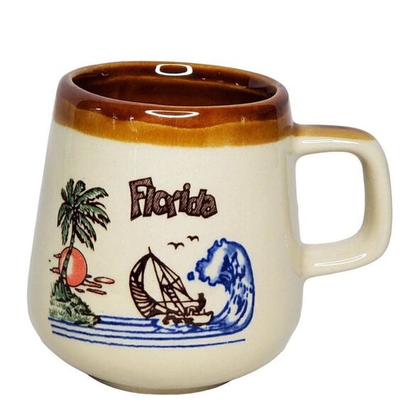 Vintage Souvenir Florida Dinghy Sailing Ceramic Coffee Mug Palm Tree Sun Set Big Wave