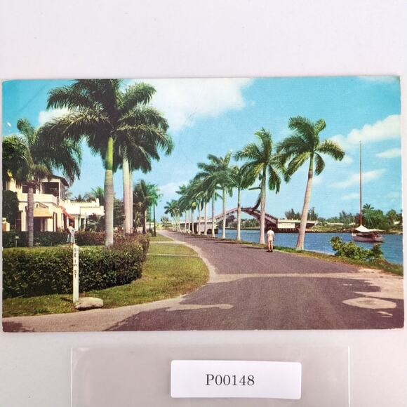 Vintage Florida Postcard Delray Beach Marine Way 1956 Bridge Palm Trees