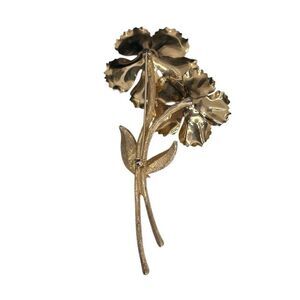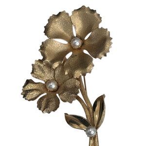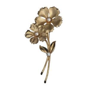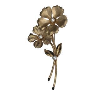 A gold-plated design with a textured finish. The brooch showcases two beautifully crafted flowers, each adorned with freshwater pearl center accents. Measuring approximately 4 1/2” x 2 1/4”, its graceful structure makes it a striking accessory for any outfit. Secured with a classic rollover clasp closure.