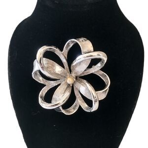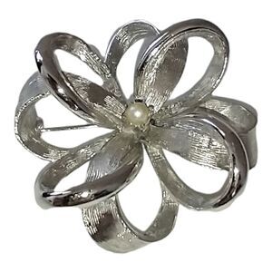 Vintage Flower Brooch Ribbon Pin Faux Pearl Silver Tone Brushed Large Open Work.