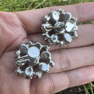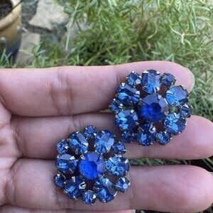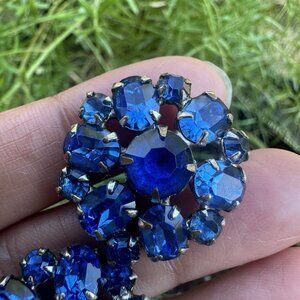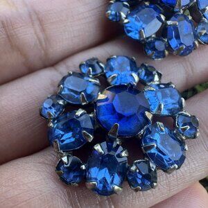 Add a touch of vintage elegance to your outfit with these beautiful flower earrings. The stunning blue rhinestone crystals form a cluster around a silver tone screw back closure, giving a unique and stylish look. Perfect for any occasion, these earrings are a great addition to any jewelry collection. The stud style and round shape of the main stone make them a versatile choice for any fashion-conscious woman. The earrings are a vintage piece, adding a touch of nostalgia to your look. They are a great gift for a loved one, whether it's for Mother's Day, Christmas, an anniversary, or a birthday. Mid century modern MCM likely from the 1930s to 1960s time frame. The stones really pop and the silver tone metal may be rhodium plated with some wear in spots.