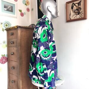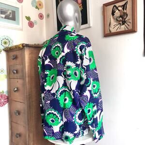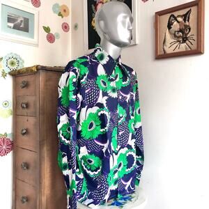 Phenomenal, groovy, bold, and colorful vintage shirt! This absolute STATEMENT comes to you courtesy of Jaime Roman. Navy blue with kelly green, white, and purple to create this massive oversized flower print. The collar is stiff and elongated, there is a chest pocket, and the hem is straight in case you want to wear it untucked. Made of 100% "textured polyester", this shirt is pure 60s excess. Delectable dopamine dressing at its finest.