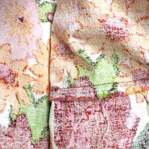 Vintage Flower Power Floral Print Bark Cloth Fabric, a stunning testament to the vibrant 1970s aesthetic. Featuring a rich, multicolored floral pattern, this medium-weight fabric brings a touch of mid-century charm to any space. Crafted by House & Home Fabrics, it epitomizes the era's love for bold prints and relaxed style. Ideal for a range of creative projects, the fabric's sewn panels offer a cohesive look that's ready to integrate into your decor. Whether you're Curtius to refashion a room or add a pop of retro flair to your fabric creations, this bark cloth is your go-to for an authentic slice of MC mod groovy Boho.
