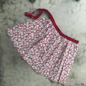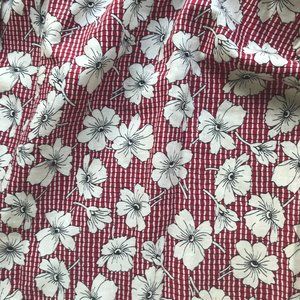 Printed cream and black flowers scattered on a red plaid ground. 100% cotton percale. Waistband is a 1.5" red velveteen ribbon. Total length of ribbon is 67". Closure is a simple 5" slit (slightly torn at bottom). I used to secure it with a safety pin. Raw edge hem. Waist 36". Length 20.5". Hand sewn for Show Pony boutique in Echo Park, Los Angeles. Bought in the 90s.