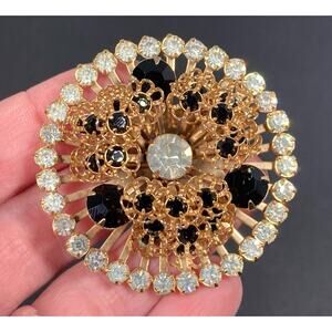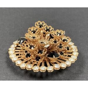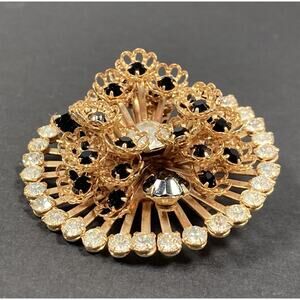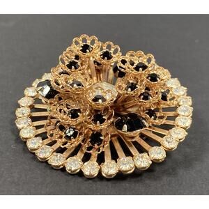 Vintage Flower Rosette Layered 3D Filigree Rhinestone Gold Brooch Unique. This has some light surface scratches and tarnish to the back but this is otherwise this is in excellent condition. The rhinestones are dark and look almost black. This measures 2” L x 1” H. Such a beautiful piece. Please message me prior to purchase with any questions. Thank you!