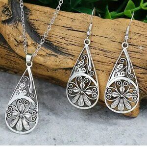 Vintage Flower Water Drop Design matching Necklace and Earring Set – Silver Electro-Plated