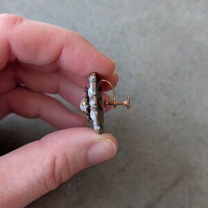 I'm not sure about the exact materials in these earrings, but when researching, I found several similar pairs of earrings that were described as having copper filigree, fluss glass, and lucite