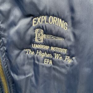 The Vintage Flyer's Man Intermediate Bomber Jacket Alpha MA-1 is a stylish and versatile piece perfect for men size XL. This reversible jacket features a classic blue and orange color scheme with a durable nylon outer shell and lining. Designed with polyester fiber insulation, it is ideal for various activities like walking, flying, hunting, and hiking. The vintage bomber style adds a touch of retro flair, while the USA theme and Leadership Institute branding give it a unique and patriotic appeal. Perfect for those looking for a practical and fashionable outerwear option.
