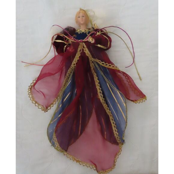 Velvet flying angel ornament wearing a burgundy & blue gown