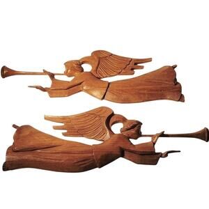 Bring a sense of peace and faith into your home with this beautiful, carved wood flying angels holding horns. Carefully crafted with fine details in the flowing gown and angel wings, this piece showcases timeless artistry.