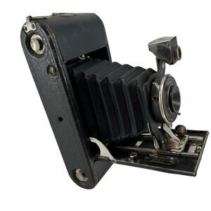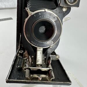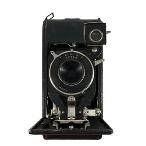 Classic vintage folding bellows camera featuring an Actus shutter with aperture settings f/16 to f/128. Includes its original fitted black leather case with latch closure. Bellows appear intact, camera body shows age-related wear consistent with use. The case is sturdy with scuffs and edge wear from age. Camera is offered as untested since it has not been film-tested. A great display piece or collectible for vintage camera enthusiasts. Untested vintage condition. Wear on metal trim and leather case, some scuffs and scratches. Please review pictures for details.