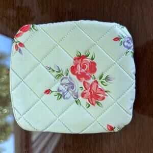 Vintage Folding Travel Mirror with Vinyl Floral Storage Pouch . In very nice vintage condition. One side is a standard mirror and the other side is a magnified mirror. Fits perfectly into vinyl travel pouch.