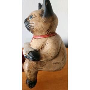 Absolutely charming hand-carved and hand-painted, blue-eyed cat with a red tie and an open book! Nice patina to the wood. Tan-colored with dark ear tips and paws. Sits on shelf edge. A little wear on front of left paw and left ear tip (see pics). Great way to add old world character to any room! Approximately 7" from ear tip to end of paw. Approximately 4" in depth. Weight is 14.5." Please see all photos and zoom in as they are part of my description.