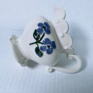 Vintage Folk Art Creamer/ Small Pitcher Ceramic Hand Painted White w/Blue Flower