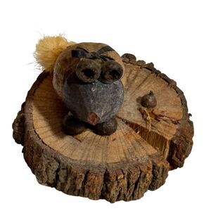 Vintage Folk Art MCM Handmade Nut Mouse on Driftwood Stump Decor Woodland