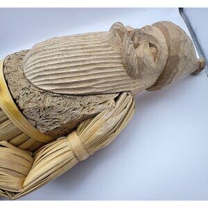 Vintage Folk Art Santa Figurine with Basket Handcrafted Wood and Straw Statue