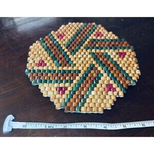 This vintage folk art wood retro hot pad trivet is a handmade custom piece featuring intricate wooden beads as a decorative accent. With a retro style and art theme, this trivet is both functional and aesthetically pleasing. Made from wood in the United States, this unique and one-of-a-kind kitchen tool adds a touch of vintage charm to any home. Perfect for adding a pop of color and character to your kitchen decor, this handmade trivet is a must-have for collectors and those who appreciate artisanal craftsmanship.