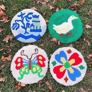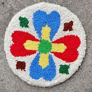 vintage decor, hand-hooked rug, floral pattern, heart-shaped petals, mid-century modern, retro aesthetic, handmade textiles, bohemian, farmhouse chic, cottagecore, maximalist, colorful decor, wall art.