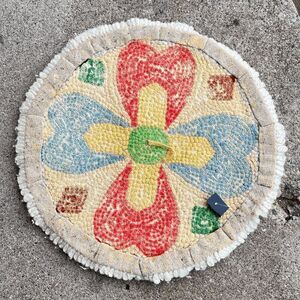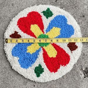 Charming vintage punch needle accent rug featuring a vibrant floral design with heart-shaped petals in red and blue, a yellow cross center, and green accents, all set on a creamy white background. Expertly hand-crafted with a looped texture and durable backing, this round rug measures approximately 13 inches in diameter. This versatile piece is perfect for a small wall hanging, table centerpiece, stool seat pad (see example), or a unique decorative accent for any coastal or cottage-style home. It could also be easily converted into a beautiful throw pillow. Excellent craftsmanship and vibrant hues make this a standout piece from mid-20th-century textiles.