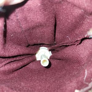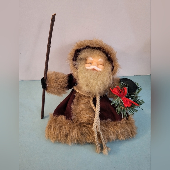 Vintage folks Santa in a fur trimmed coat carrying a staff and wreath. under his coat is a small stick to be able to put him in a bottle. you could also place him in your tree. measures 8x8