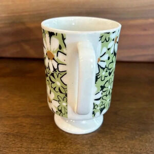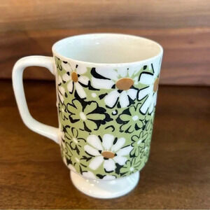 Vintage Footed Pedestal Coffee Mug 8 oz Retro Floral Green & Black JAPAN EUC