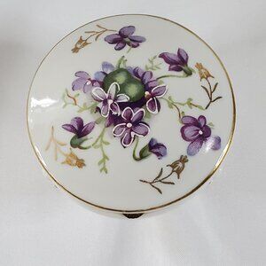 Elegant porcelain trinket box featuring delicate hand-painted purple and lavender floral design, ideal for storing small treasures or as a refined decorative accent.