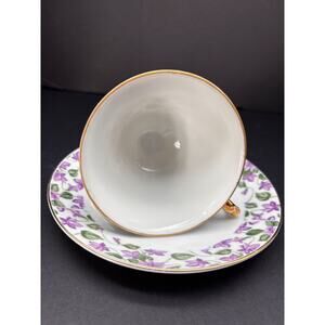 Vintage Violet Floral Chintz, Teacup cup & Saucer Set with Gold Trim, Made in Japan, . Lovely Purple Violet Floral pattern with gold trim, and nice gold trimmed foot and unique handle.