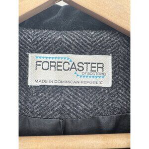 This Vintage Forecaster of Boston Overcoat Size 12 features a Solid charcoal gray Textured fabric in a Classic Structured longline silhouette and herringbone pattern. The design includes a Statement black velvet collar, two-button front closure, and flap pockets, aligning with Retro, Minimalist and Indie aesthetic keywords. Crafted from a premium blend of 77% Wool, 15% Nylon, and 8% Cashmere. Condition is Excellent Pre-Owned. Pit to Pit: 21 inch, Length: 50 inch, Shoulder: 17 inch, Sleeve Length: 25 inch. Made in Dominican Republic #ForecasterCoat #WoolCashmere #RetroIndie #ClassicOvercoat #VintageStyle