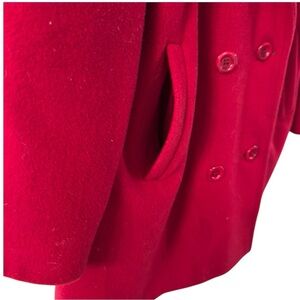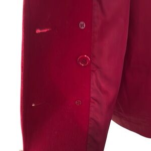 Gorgeous red wool coat, right on trend! Double-breasted with an extra button sewn on the inside edge. There are 2 lined side pockets in the front. There is are tiny marks on inside lining as shown in picture. Fully lined. In excellent condition.