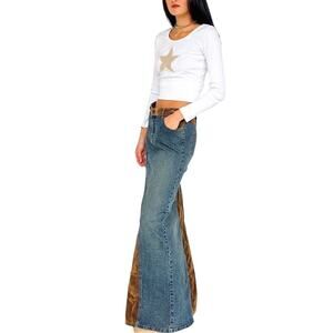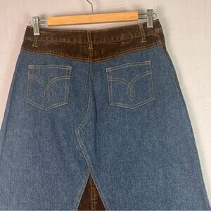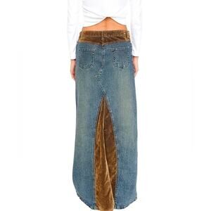 Vintage Y2K Forenza floor length maxi denim jean skirt with chocolate brown velvet insets and trim. Patchwork details, zip fly, 5 pocket, long a-line cut with slit in back. Cotton and rayon with stretch.