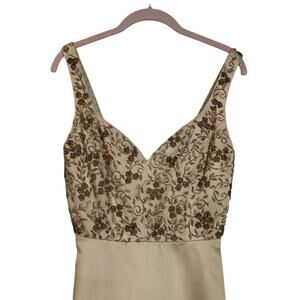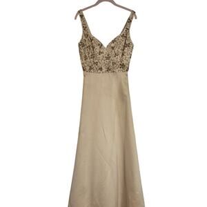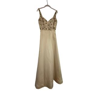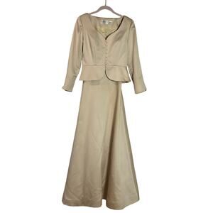 This gorgeous formal gown and jacket is vintage and in perfect condition! See pictures for full details. The beading is gorgeous and the gold is perfectly glamorous! Such a special statement look!
