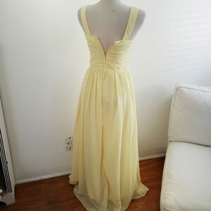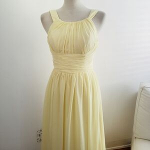 Lovely for any age. Pastel yellow greecian style floor length gown. This dress has been worn before and may have a few spots, but nothing truly noticeable. It has been laundered once, but should be dry cleaned again upon receipt.