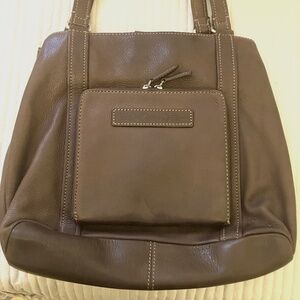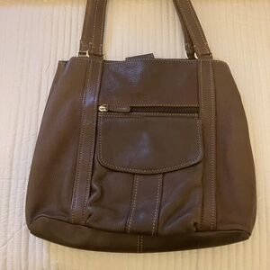 This is a vintage Fossil 1954 women's brown genuine pebbled leather shoulder bag, 75082. It is very spacious and has many pockets and compartments, well-functioning zippers, and excellent Fossil quality. This bag is not new and is in good condition.
