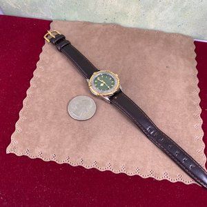 Vintage Fossil Blue Sports Watch Green Watch Face with 1.1 inch in Diameter Mineral Crystal Gold Bezel and Tachymeter with Night light a very nice Gold Tone 8 inch Brown Leather Strap LU-2597 New Battery Fully Serviced almost new two tone with Stainless Steel Back Luminous Gold Hands and raised accents, Green Dial Face with pointed second hand excellent condition no scratches