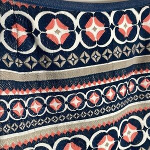 This eye-catching mini skirt by Fossil features a vibrant blue and pink color palette, perfect for casual or resort wear. The pencil style is enhanced with intricate embellishments, offering a chic and stylish look. Its form-fitting design ensures a flattering silhouette, making it a standout piece for any wardrobe.