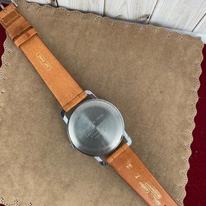 Vintage Vert early 80’s Fossil Collection Moonphase Watch Silver Tone Bezel with Stainless Steel Back 1.625 inch case Black Hands and Fancy Arabic Numeral Accents . Starry Night Moon Lit Face first quarter to last quarter size moons Moon Hong Hong Movement New Speidel 10 inch Brown/Tan Sports Leather Strap. light scuffs to Mineral Crystal Beautiful Moonphase Watch, Sun, Stars, Moon, Celestial unisex