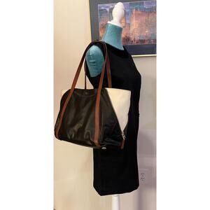 Interior has 2 media wall pockets, 1 zip wall pocket. Lined. Colorblock. Wear 2 ways.