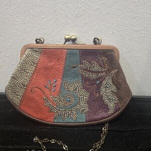Vintage Fossil Kiss Lock Brown Multi Leather Embroidered Coin Wallet Purse